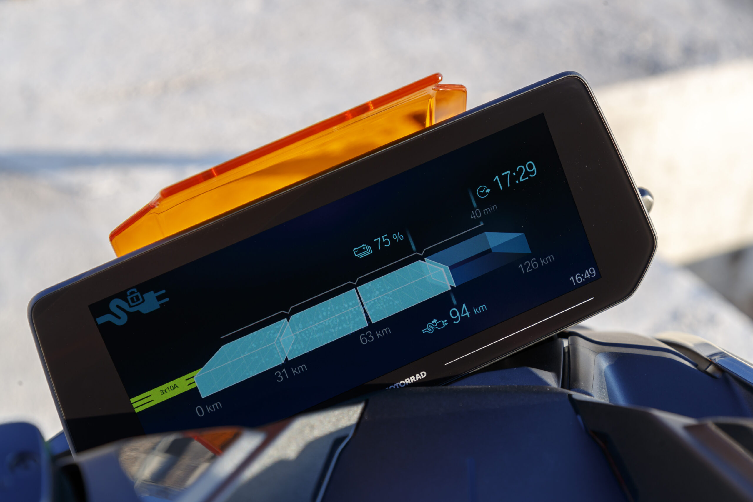 Мягкое двухместное сиденье со спинкой и функцией обогрева способствует удобной посадке. Зарядка аккумулятора происходит от обычной розетки 220 В или зарядного приспособления BMW Wallbox. Основная информация отображается на TFT-дисплее Full HD 10.25 дюймов со встроенной навигацией. Антибликовое покрытие защищает от царапин. Синхронизация смартфона выполняется с помощью приложения BMW Motorrad Connected. Для зарядки девайсов предусматривается разъем USB-C.