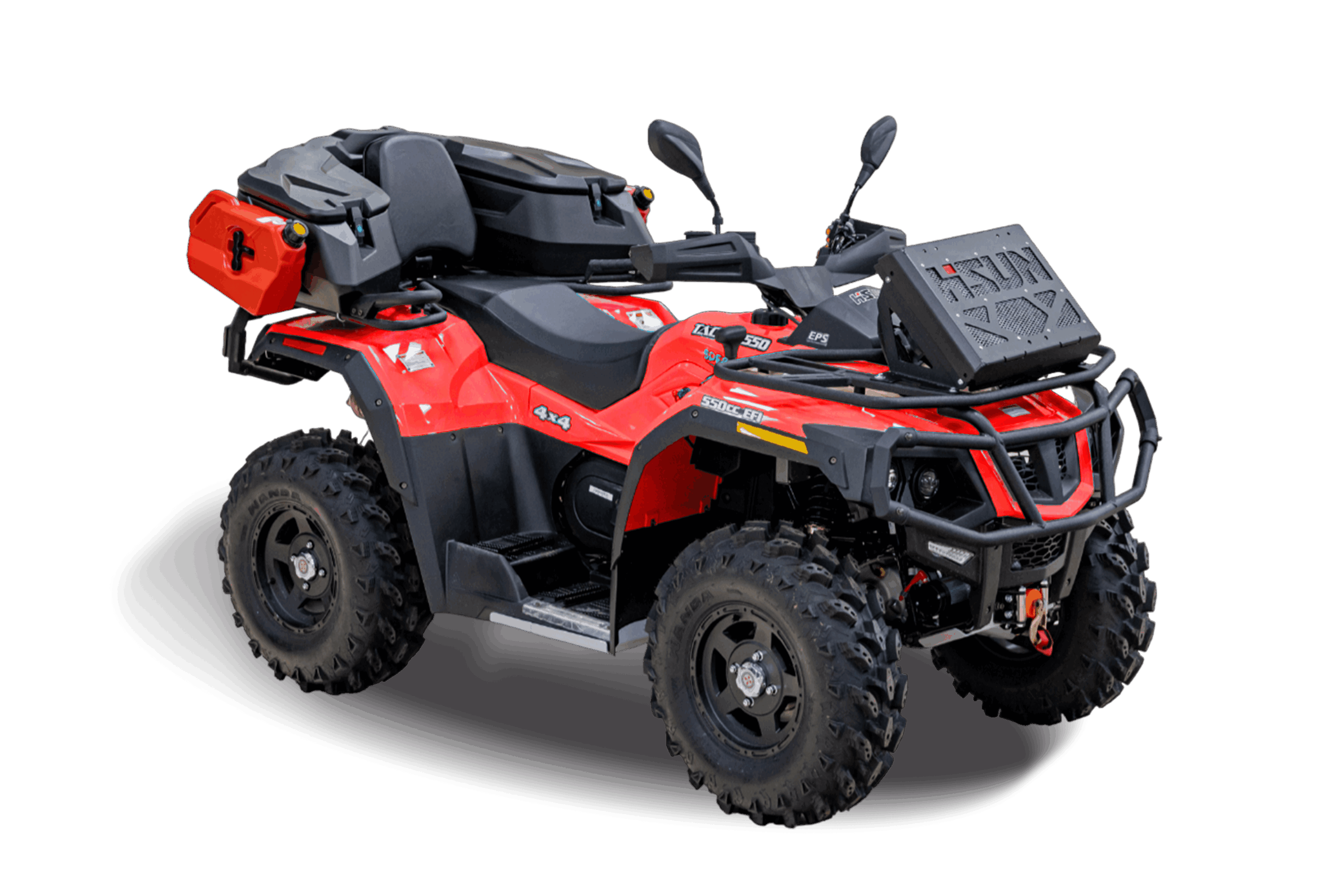 Электроусилитель руля делает управление мототранспортом более простым. Для защиты узлов и агрегатов от механических повреждений предусматривается защита днища. Линзовые передние фары эффективно освещают дорогу. Широкое двухместное сиденье имеет спинку для удобной посадки. Ручки с подогревом обеспечивают комфортную эксплуатацию квадроцикла в холодную пору.